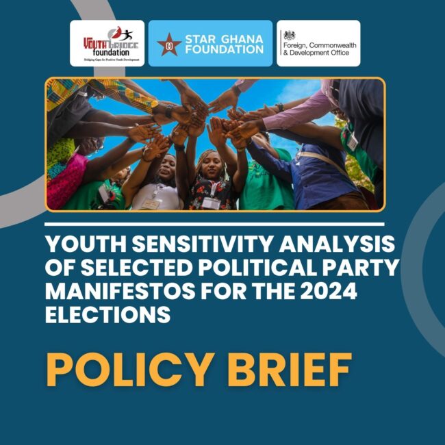 To Empower Youth to Elevate Accountability, Youth Bridge Foundation (YBF) commissioned a sensitivity analysis of the political party manifestos for the 2024 general elections in Ghana to determine whether they align with the aspirations of Ghanaian youth. This report reviews the manifestos of the New Patriotic Party (NPP), the National Democratic Congress (NDC) and the Movement for Change (M4C), emphasizing the alignment with the African Union (AU) Youth Charter, the ECOWAS youth policy and strategic action plan, Ghana National Youth Policy (NYP), National Commission for Civic Education (NCCE) matters of concerns to the Ghanaian voter, and the Ghanaian Youth Aspiration.